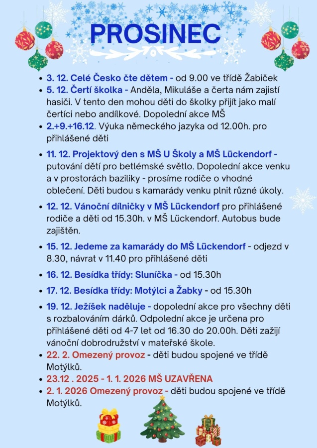 • 11. 12. Projektový den s MŠ U Školy a MŠ Lückendorf - putování dětí pro betlémské světlo. Dopolední akce venku a v prostorách baziliky - prosíme rodiče o vhodné oblečení. Děti budou s kamarády venku plnit různé úkoly.