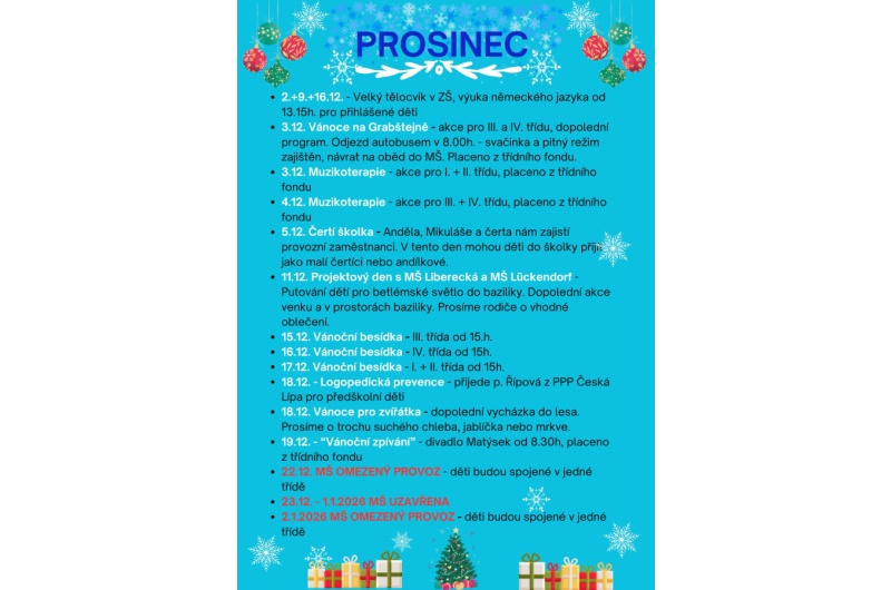 • 3.12. Vánoce na Grabštejně - akce pro Ill. a IV. třídu, dopolední program. Odjezd autobusem v 8.00 h. - svačinka a pitný režim zajištěn, návrat na oběd do MŠ. Placeno z třídního fondu.