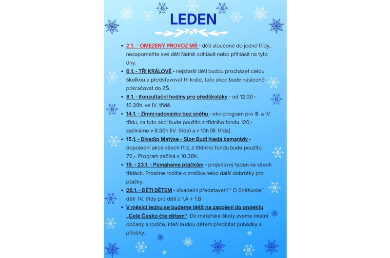 • 14.1. - Zimní radovánky bez sněhu - eko-program pro Ill. a IV. třídu, na tuto akci bude použito z třídního fondu 120 Kč, začínáme v 8.30 h (IV. třída) a v 10 h (Ill. třída).