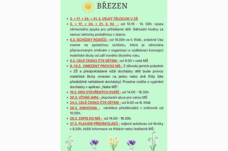• 27.3. PLAVÁNÍ předškoláků - odjezd autobusu od školky v 8.20, bližší informace ve třídách nebo ředitelně MŠ.