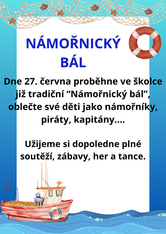 Dne 27. června proběhne ve školce již tradiční “Námořnický bál”,oblečte své děti jako námořníky, piráty, kapitány.... Užijeme si dopoledne plné soutěží, zábavy, her a tance.