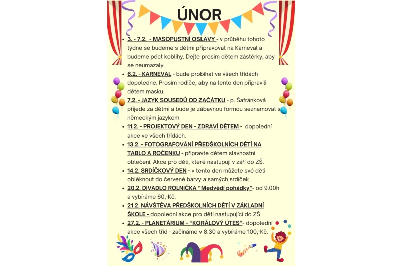 • 3. - 7. 2. - MASOPUSTNÍ OSLAVY - v průběhu tohoto týdne se budeme s dětmi připravovat na Karneval a budeme péct koblihy. Dejte prosím dětem zástěrky, aby se neumazaly.