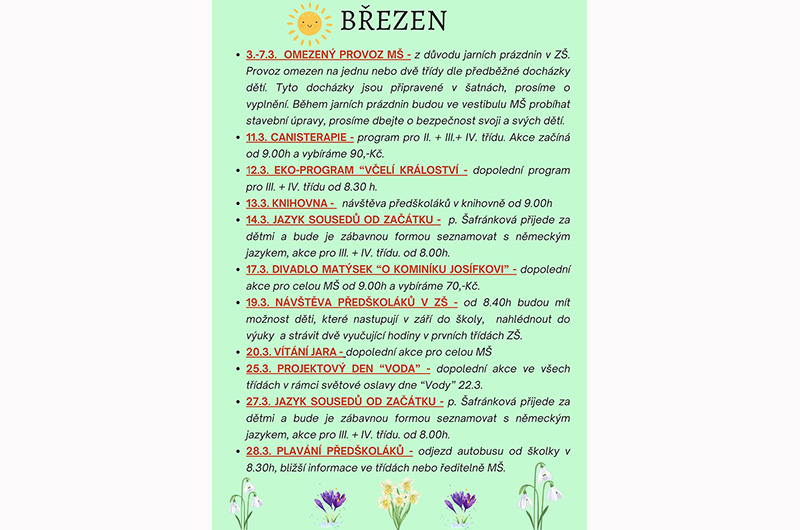 • 28.3. PLAVÁNÍ PŘEDŠKOLAKŮ - odjezd autobusu od školky v 8.30h, bližší informace ve třídách nebo ředitelně MŠ.
