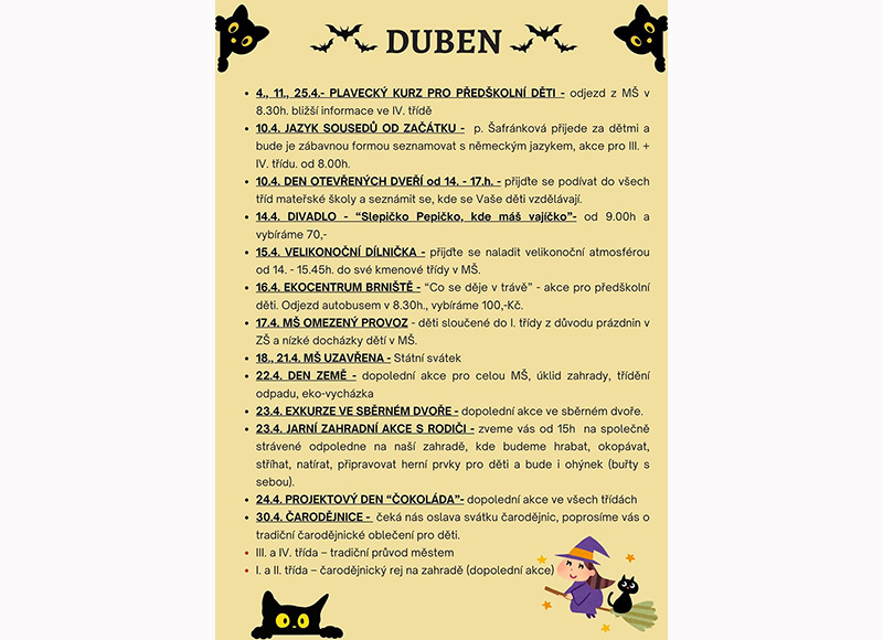 • 30.4. ČARODĚJNICE - čeká nás oslava svátku čarodějnic, poprosíme vás o tradiční čarodějnické oblečení pro děti.