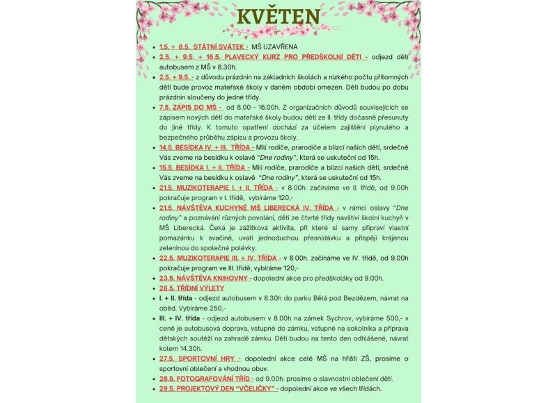 • 28.5. FOTOGRAFOVÁNÍ TŘÍD - od 9.00h. prosíme o slavnostní oblečení dětí.