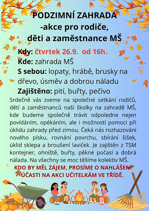 Srdečně vás zveme na společné setkání rodičů, dětí a zaměstnanců naší školky na zahradě MŠ, kde budeme společně trávit odpoledne nejen povídáním, opékáním, ale i možností pomoci při úklidu zahrady před zimou. Čeká nás rozhazování nového písku, rovnání povrchu, sbírání šišek, úklid sklepa a broušení laviček. Je zajištěn z TSM kontejner, ohniště, buřty, pěkné počasí a dobrá nálada. Na všechny se moc těšíme kolektiv MŠ.
