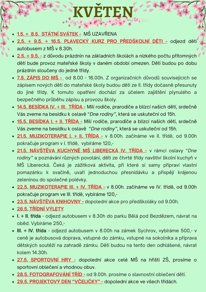 • 28.5. FOTOGRAFOVÁNÍ TŘÍD - od 9.00h. prosíme o slavnostní oblečení dětí.