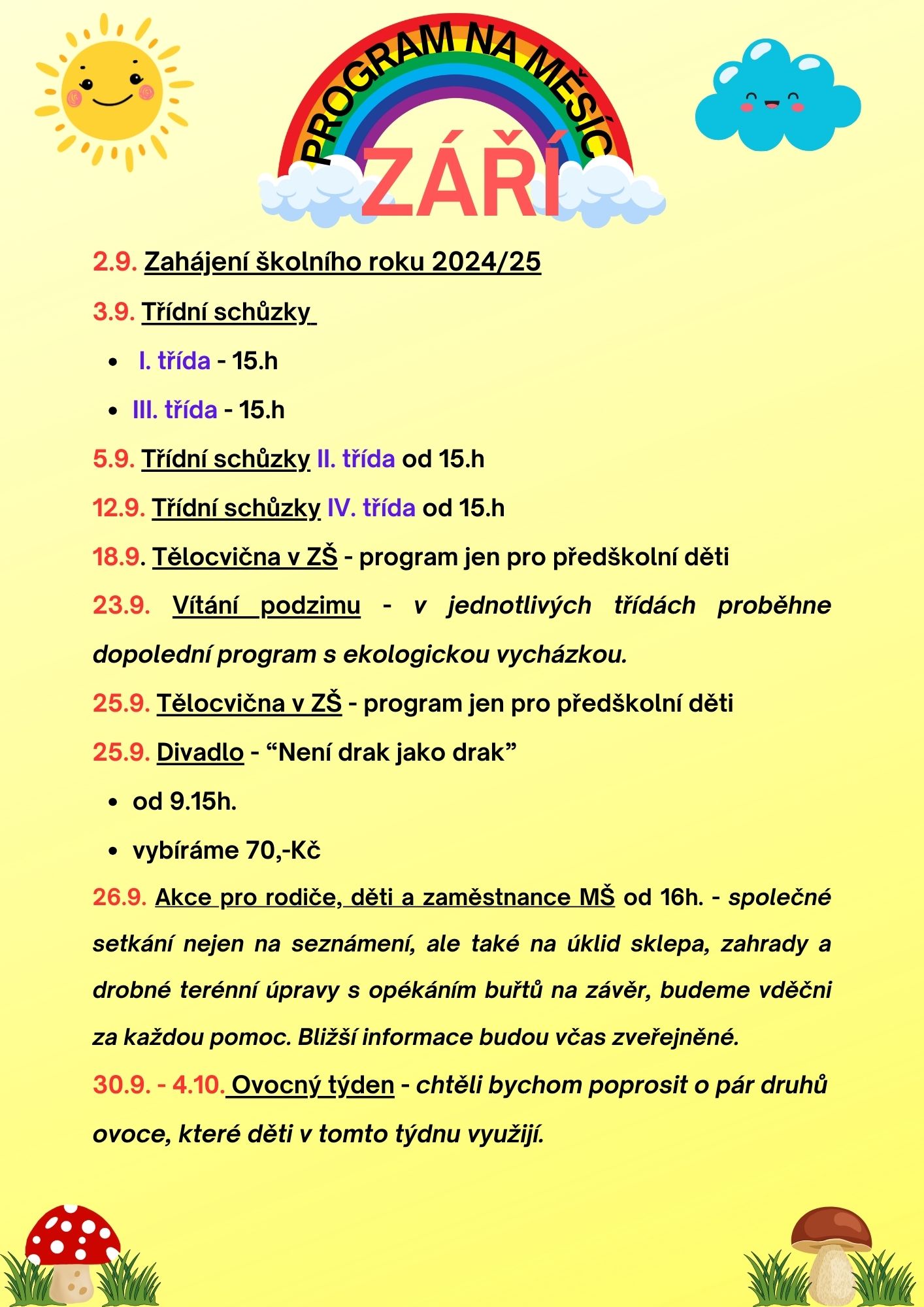 26. 9. Akce pro rodiče, děti a zaměstnance MŠ od 16 h - společné setkání nejen na seznámení, ale také na úklid sklepa, zahrady a drobné terénní úpravy s opékáním buřtů na závěr, budeme vděčni za každou pomoc. Bližší informace budou včas zveřejněné.